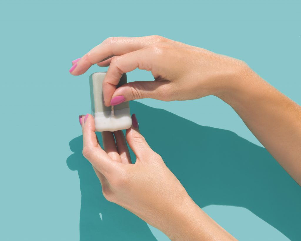 So how does the zero waste deodorant bar work? The bar, which contains the same amount of product that is in a plastic tube, is wrapped in a pliable wax that fits perfectly in the palm of your hand. Simply swipe the bar on underarm skin, as you would with traditional deodorant, and store in the organic cotton bag that comes with the product. When you get to the base of the bar, pull the wick to break the wax, and peel away the wax as you use the remaining product. The last bits get rolled onto your skin.
