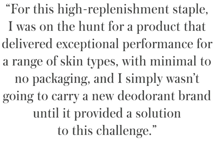 Cleo+Coco has already succeeded in formulating a range of deodorants that work. I don’t mean they work for a few hours…these formulas stand up to conventional deodorants, and they smelled incredible, too. But when I initially tried the range, I wasn’t compelled to bring in another deodorant brand in plastic tubes. Despite the efficacy of Cleo+Coco’s product, I felt strongly that the future of natural deodorant had to evolve. Knowing the average American will use a whopping 800 tubes of deodorant in their lifetime, most of which will go unrecycled, this felt like the next frontier for Blue Beauty.