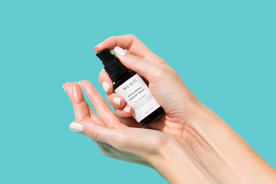 Plump skin with Mukti Hyaluronic Marine Serum, an intensely hydrating, rapidly absorbing blue-green gel that increases skin’s cushiony suppleness while strengthening the skin’s moisture barrier. Gently pat two pumps-worth into freshly cleansed and toned skin.