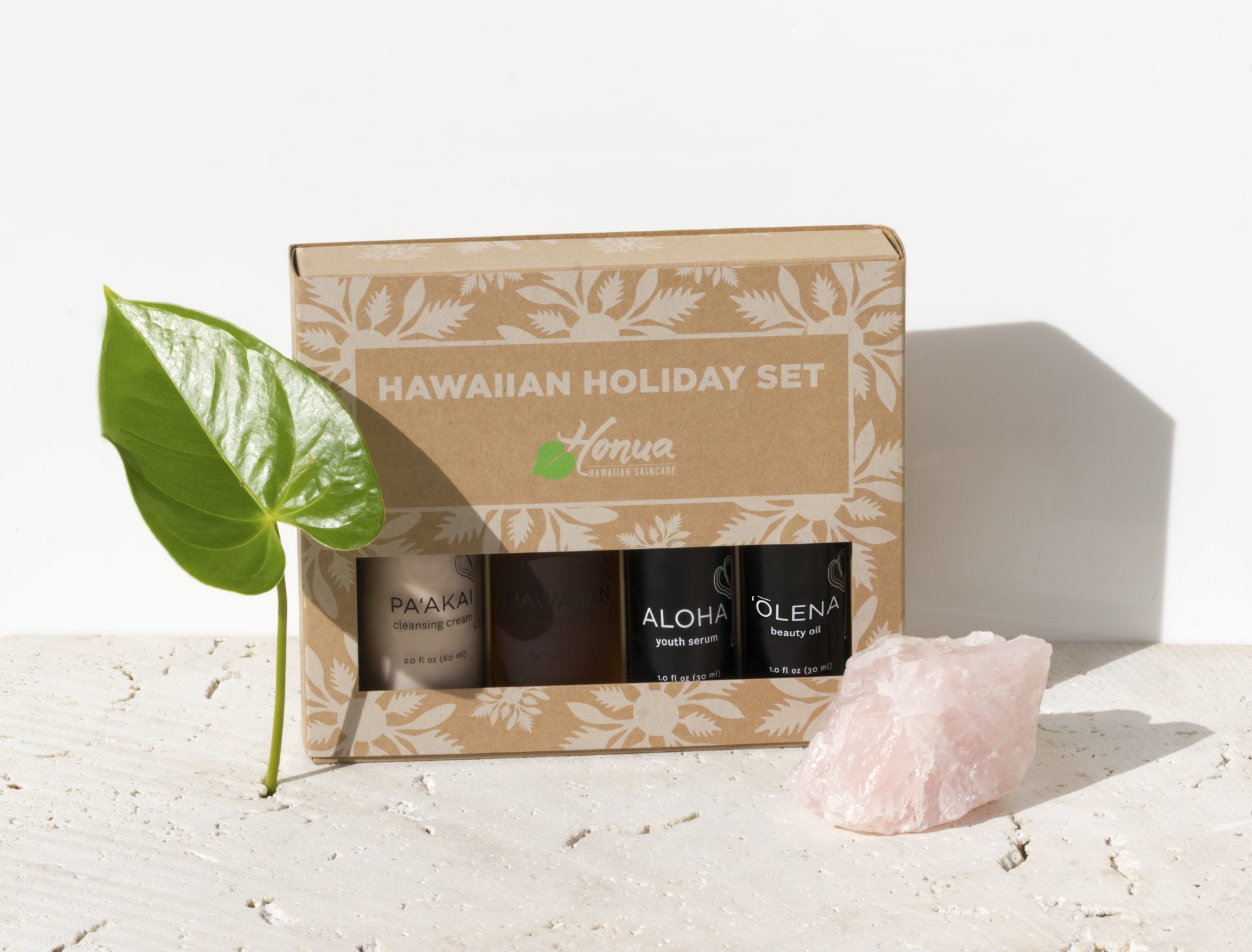 Honua Ritual Kit – perfect for travel and ideal for all skin types, this daily ritual invites you to cleanse, exfoliate, hydrate and treat, Aloha style. Featuring a 2 oz Paakai Cleanser, 2oz Beauty Water, 1 oz Aloha Youth Serum and 1 oz Olena Oil.